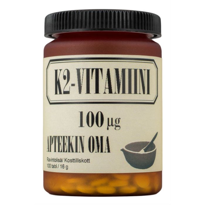Apteekin Oma K2 100 µg –vitamiini on vahva K2-vitamiinivalmiste ja se sisältää luontaista K2-vitamiinia (menakinoni-7). K-vitamiinia tarvitaan veren hyytymiseen ja kalsiumin aineenvaihduntaan. K2-vitamiini kerää kalsiumia verenkierrosta ja kuljettaa sen luustoon. Valmiste ei kuitenkaan sisällä muita aktiiviaineita, sillä K2-vitamiini hajoaa helposti säilytyksen aikana muiden aineiden, mm. kalsiumin vaikutuksesta, mikäli ne ovat samassa valmisteessa.