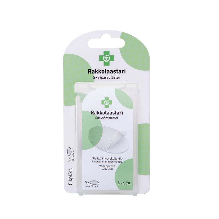 Pakkauksessa 5 soikeaa rakkolaastaria, koko 44 mm x 69 mm.