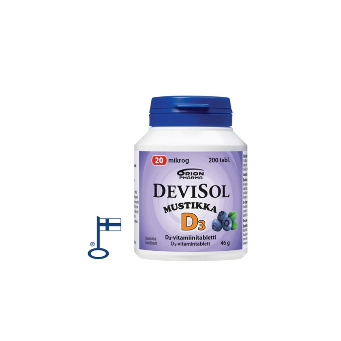 Devisol Mustikka 20 mikrog on aidon mustikan makuinen D-vitamiini puru-/imeskelytabletti. Makeutettu ksylitolilla ja sorbitolilla. Sisältää hyvin imeytyvää D3-vitamiinia. Saatavilla 200 tabl. pakkauksissa.