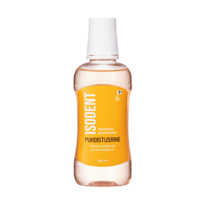 Miten IsoDent poikkeaa jo markkinoilla olevista proteesien puhdistusaineista? IsoDent on kehitetty erityisesti proteesien syväpuhdistamista varten. Se on erittäin tehokas ja jättää proteesiisi raikkaan mintun maun. Huomaathan, että IsoDent hammasproteesien puhdistusaine on tarkoitettu ainoastaan ulkoiseen käyttöön proteesiesi puhdistamiseksi. Bakteerien, sienikasvustojen ja värjäytymien lisäksi se liuottaa proteesistasi myös hammaskiven. IsoDent on nestemäinen tiiviste ja se myydään riittoisassa 250 ml pullossa, joka kestää yhdellä käyttäjällä jopa 3 kuukautta päivittäisessä käytössä. Mihin IsoDent hammasproteesien puhdistusaineen teho perustuu? IsoDent hammasproteesien puhdistusaine puhdistaa kaiken tyyppiset hammasproteesit, metalliproteesit ja pehmeät proteesipohjat hellävaraisesti mutta tehokkaasti. Teho perustuu erityiseen jääetikkahapon ja orthofosforihapon seokseen. Orthofosforihappo irrottaa kiinteän hammaskiven kun jääetikkahappo orgaanisena happona poistaa värjäymiä ja plakk
