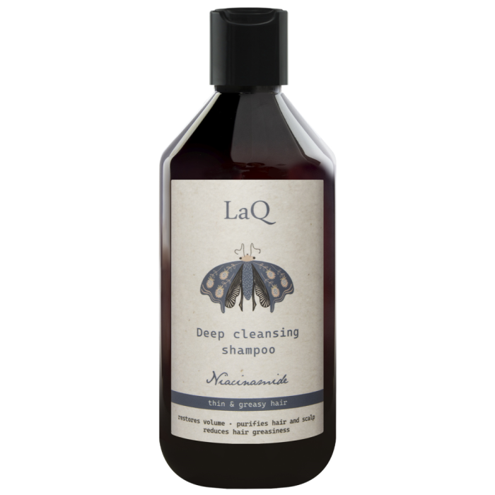 Djuprengörande schampo med niacinamid för behandling av tunt och fett hår. Består av milda växtbaserade rengöringsmedel. LaQ är vegansk naturkosmetik – en kombination av veganska och naturliga ingredienser, underbara produkter, vackra dofter och underbara färger.