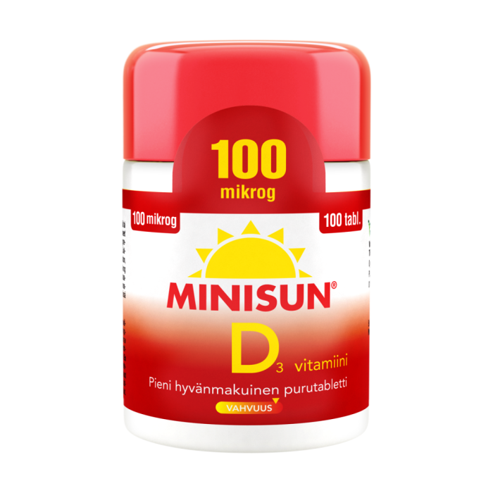 Pieni, hyvänmakuinen purutabletti. D3-vitamiinivalmiste. Sisältävät hyvin imeytyvää D3-vitamiinia ja tablettien annostelu on helppoa. Yksi purutabletti päivässä riittää.