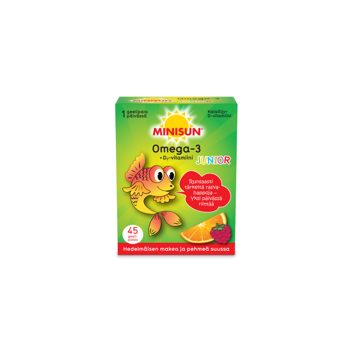 Minisun Omega-3 + D3-vitamiini Junior on geelipala, joka sisältää kalaöljyä sekä D3-vitamiinia. Geelipala on hedelmäisen makea ja pehmeä suussa, makuina vadelma, appelsiini ja sitruuna. Sopii lapsille kahdesta ikävuodesta alkaen.